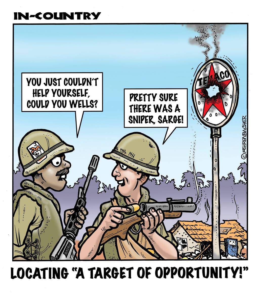 Phil enlisted in the Army in 1965 where you served for years in Vietnam. He became a graphic designer and has worked for the state of Oregon for 26 years. He retired in 2003 and started the Cartoon "In-Country". The cartoons reflect his experiences during his tour of duty in South Vietnam.